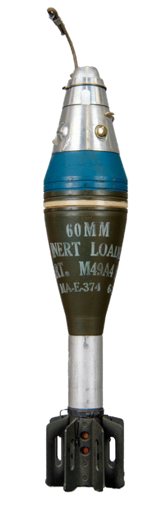 - Markings: Stenciled white or black nomenclature indicating “60MM MORTAR M49A3 HE”