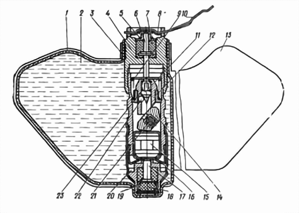 A: The PFM-1 uses a liquid explosive system (VS-60 or VS-2D compounds based on nitroglycerine) that is integral to its simple, lightweight design. The mine’s entire body is essentially a thin-walled plastic container filled with liquid explosive, with the fuzing mechanism built into this structure. When pressure is applied to the wing or top surface, the plastic deforms and an internal ampoule ruptures, initiating the explosive reaction. Liquid explosive was chosen for several practical reasons: (1) It allowed for simpler, cheaper manufacturing with no complex fuze assembly required, (2) It reduced weight significantly compared to solid explosive plus metal casing, enabling aircraft to carry many more mines, (3) The liquid explosive could be poured into the plastic body during manufacturing, streamlining mass production, (4) It provided adequate blast effect for the intended anti-personnel role without requiring large quantities. The downside is that liquid explosives are more sensitive to temperature extremes and may degrade faster than solid explosives over time. However, for Soviet doctrine emphasizing mass deployment of cheap, disposable mines, these trade-offs were acceptable.