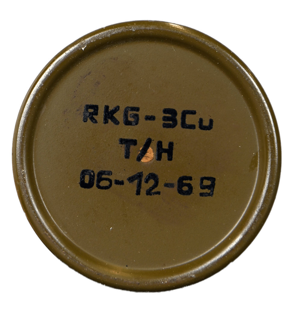 The RKG-3 (Ruchnaya Kumulyativnaya Granata model 3, meaning “Hand Cumulative Grenade model 3”) is a Soviet-designed anti-tank hand grenade featuring a shaped charge (HEAT – High Explosive Anti-Tank) warhead. Distinguished by its unique aerodynamic stabilization system with a fabric drogue parachute, the RKG-3 represents an innovative approach to infantry anti-armor warfare. Designed for use against armored vehicles, fortifications, and hardened targets, the RKG-3 employs a hollow-charge principle to defeat armor through a focused jet of superheated metal rather than traditional fragmentation.